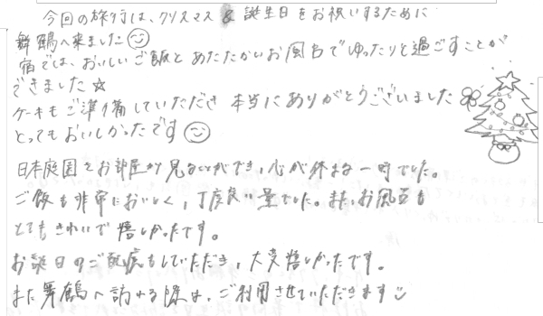 | 先日は、お世話になりました。心地よいひと時を与えていただいたおかげで、旅の疲れをゆっくり癒すことができ、残りの旅も無事に楽しく過ごせました。お風呂につきましても、たっぷりの温かいお湯を 家族3人で十分に堪能させていただきました。お食事のカニもおいしくいただけました。館内も広く、清潔で、安心してのびのびと過ごせました。 |