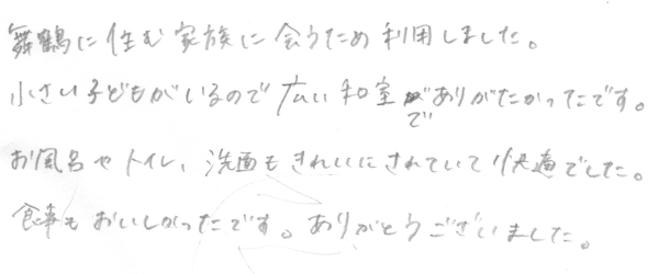 | 先日、家族で宿泊させて頂きました、大阪の○○です。 その節は大変お世話になり有り難うございました。 宿泊した率直な感想としては、妻も子供も非常に満足して 気に入りました。安いので、期待はしていませんでしたが本当に良い意味で驚きました。 特に広いお部屋には感激しました。旅の疲れがかなりとれました。 舞鶴に旅行する際は、また宿泊させて頂きますので その時はどうぞ宜しくお願いいたします。 |